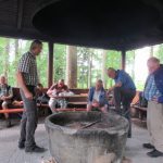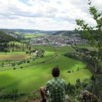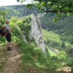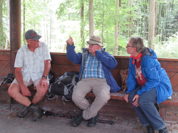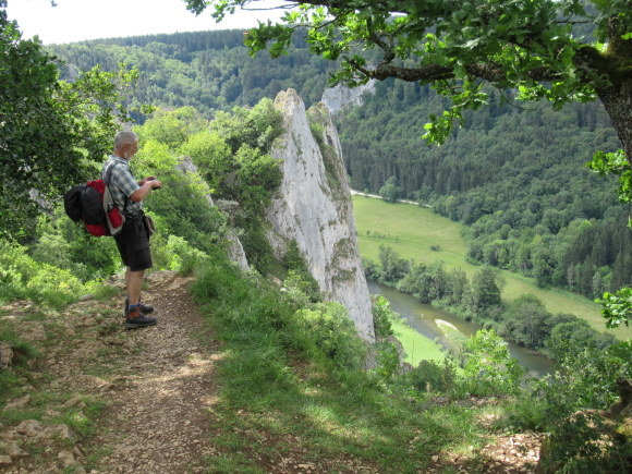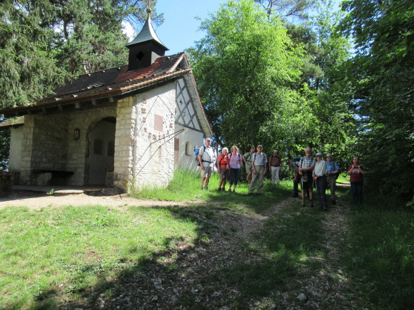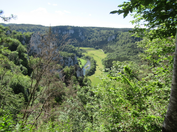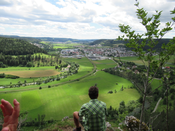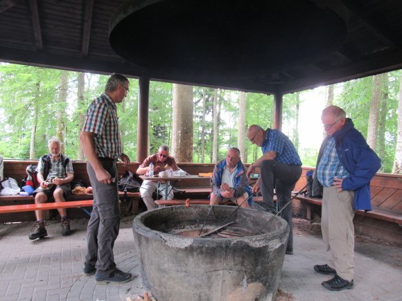 Wie vereinbart trafen wir uns am Sonntagmorgen gegen 7:50 an der Schule. Schnell hatten sich die 13 Teilnehmer auf die Autos verteilt. Über Tübingen, Dusslingen, Balingen ging es über den Lochen zum Bahnhof Mühlheim. Wir konnten mit der nächsten Bahn nach Fridingen fahren. Wir gingen durch den Ort Fridingen begleitet von den Kirchenglocken und waren sehr schnell auf dem Weg zum Laibfelsen, wo wir die ersten Bilder vom Donautal machen konnten. Langsam waren wir auf der Hochebene des Donautales angelangt und hatten vom Stiegelesfelsen eine sehr schöne Aussicht in das westliche Donautal Richtung Fridingen und Mühlheim. Ein paar Schritte entfernt trafen wir auf die alte Mattheiser Kapelle, an der wir auch die Sonnenuhr bestaunen konnten. Zügig gingen wir weiter Richtung Knopfmacherfelsen. Gegen ca. 11:15 kamen wir dort an. Zum Knopfmacherfelsen gelangt man auch mit dem Auto, oder Motorräder aller Art. Hier legten wir eine kurze Trinkpause ein. Am Aussichtspunkt hatten wir wieder eine herrliche Sicht ins Donautal zum Kloster Beuron, zum Jägerhaus, zum Schloss Bronnen. Hier wurden auch wieder einige Schnappschüsse gemacht.Der Knopfmacherfelsen liegt 765 m.ü.NN. Der Sage nach war am 4. April 1823 der Knopfmacher Fidelis Martin auf dem Weg nach Beuron. Bei Einbruch der Dunkelheit traf er hier das „Hardtfräulein“, das Ihn hinaus auf den Felsen führte. Da stürzte der Mann mit samt seinem Pferd hinunter. Da wir ja noch ein ganz ordentliches Pensum bewältigen mussten, gingen wir bald wieder auf einem Waldweg hinunter nach Fridingen. Als wir dort ankamen, hatten die ersten schon einen großen Hunger und wir nahmen zum Leidwesen einiger Teilnehmer den kürzeren Weg zur Kolbinger Höhle in Angriff. Der etwa 1 Kilometer lange Anstieg war schon schwerlich. Zumal es doch zwischendurch ganz schön warm war. Aber letztendlich kamen alle am Grillplatz der Kolbinger Höhle an. Die Herren der schnellen Truppe hatten auch das mitgebrachte Holz in das Feuer geworfen. Wir liesen es uns alle bei gegrillten Roten schmecken und Erwin erzählte einige Stories aus unvergesslichen früheren Wanderungen. Alfred hatte ein paar Probleme mit seiner Bonsai Grillantenne (war ein paar cm zu kurz).  Zur Belohnung durften auch die üblichen Verdauungsschnäpsle nicht fehlen. Gegen 14:30 machten wir uns auf den Weg Richtung Mühlheim. Hier konnten wir den Waldlehrpfad in Augenschein nehmen. Bevor wir uns auf den Abstieg begaben, konnten wir auf dem Gelben Fels nochmals das herrliche Panorama des Donautales bei Mühlheim geniesen. Nach ca. 1 Stunde waren wir alle wieder wohlbehalten am Auto angelangt. Über den Lochen ging es dann zurück nach Schlaitorf, wo wir den Nachmittag in der Pizzeria MEZZA LUNA bei Speis und Trank ausklingen ließen.