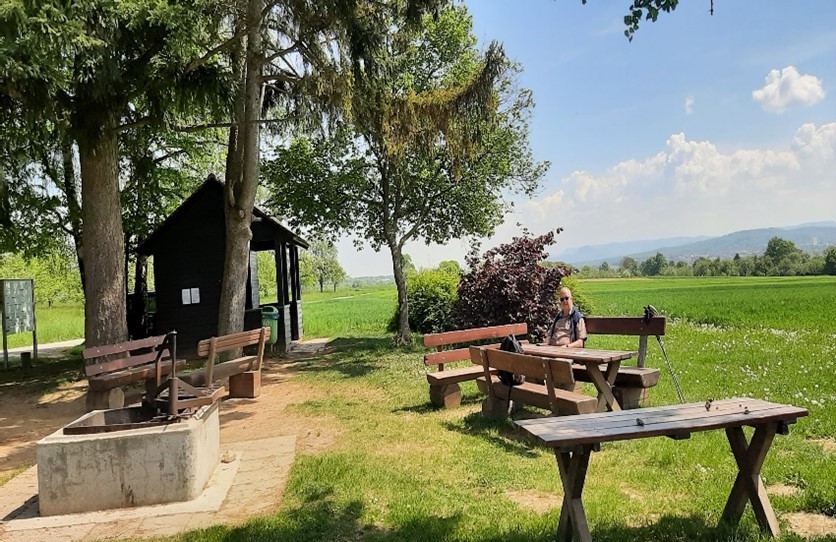 Wir orientieren uns am Wanderzeichen blauer Balken und wandern geradeaus durch die Wiesen. Am Waldrand folgen wir dem Weg zum Eckhof, den wir umgehen. Hier kommen wir zum höchsten Punkt der Wanderung (482m). An der Waldecke danach biegen wir mit dem Zeichen blauer Balken links ab und wandern am Golfplatz entlang. Von nun an haben wir ständig Blick zu der „Blauen Mauer“ der Schwäbischen Alb mit dem Roßbergturm. Durch Streuobstwiesen wandernd, erreichen wir nach ca. 4,7 km unsere schön gelegene Grillstelle mit Hütte am Kircholzhäusle. Ausgiebige Rast ist angesagt. Der Weg führt uns weiter durch Streuobstwiesen Richtung Klarasee mit immer wieder schönen Ausblicken zur Alb. An einer Hütte wird noch einmal kurze Rast gehalten (Trinkpause). Durch das Aspental geht es nun abwärts nach Dußlingen zur Einkehr im Sportheim.