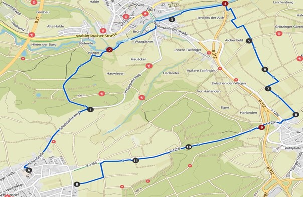 Über die Aicher Straße gehen über den Radweg nach Aich hinunter. Bald kommen wir an der „Bass uf, wo Du hindapscht!“-Skulptur vorbei. An der Festhalle vorbei überqueren wir die Neckartailfinger Str. und wandern weiter bis zum Brückle über die Aich. Links von der B312 Aichtalbrücke geht es aufwärts über ein Wiesengelände bis auf Höhe der Obstplantagen von Häußermann. Rechts von den Obstbäumen gehen wir auf einem Feldweg bis zur Linde am Kreisverkehr Richtung Schlaitdorf. Nach der Aussichtsplatte gehen wir nach links durch den Neckartailfinger Wald bis zur Richard-Haug-Hütte.
