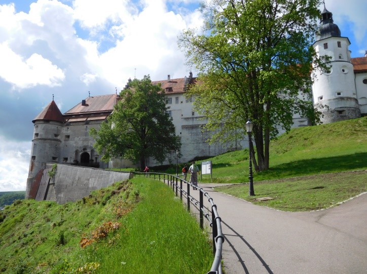 Ein Fahrzeug stellten wir auf einem Parkplatz in Bissingen ob Lontal ab, den wir am späten Nachmittag erreichten. Der Weg führte uns zunächst durch die Innenstadt von Heidenheim hinauf zum Schloß Hellenstein mit Ausblick auf die Stadt. Durch den Waldteil Schwende ging es nach Mergelstetten und weiter nach Anhausen. Hier stand mal ein Benediktinerkloster, das 1125 erbaut wurde; Prälatur, Konventsgebäude und Teile des spätgotischen Kreuzganges sind noch erhalten. Nun folgte eine reizvolle Wanderung auf schmalen Weg über den Bindstein nach Falkenstein. Von der Stelle der Hauptburg (Mitte 12 Jh., 1818 abgebrochen, sind auf dem Burgfelsen noch zwei Gebäude erhalten spätgotischer Bau mit gewölbter Halle – heute eine Domäne ). Von hier aus ist der Blick frei auf das Eselsburger Tal. Nachdem wir die B 19 überschritten hatten ging es am Waldrand entlang nach Bissingen. Nachdem die Fahrzeuge geholt wurden, fuhren wir zu unseren Quartieren nach Heidenheim zurück.