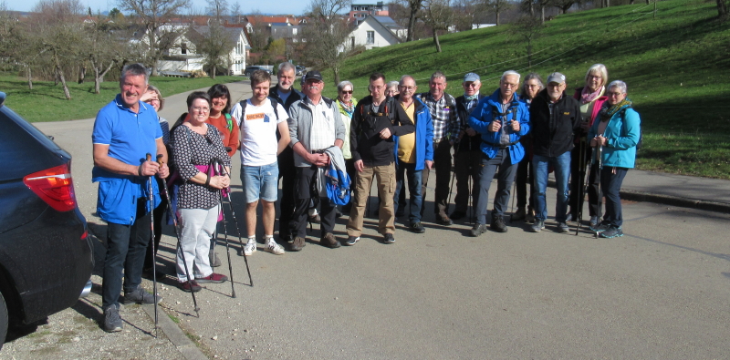 In Fahrgemeinschaften wurde der Startpunkt in Dettingen unter Teck in der nähe des Friedhofes erreicht. 21 Personen wanderten oberhalb vom Wasserschlößle, dieses wir immer noch zur Stromerzeugung genutzt, durch die Streuobstwiesen .Es war Frühlinghaftes Wetter. Am kleinen Parkplatz ist man in den Dachsbühlweg eingebogen, und bis zum Käppelestraufweg hochgewandert. Das nächst Ziel war die alte Linde, und gleich daneben die Schutzhütte mit Sitzgelegenheiten. Ein toller Aussichtspunkt mit Blick zur Teck und zu den drei Kaiserbergen. Nun folgte man dem Weg durch das Gewann Eulengreut zur Kleingartenanlage. Weiter ging es Richtung Ort, und unterhalb vom Schlossberg führte der Weg entlang der Lauter wieder zum Ausgangspunkt der Wanderung. Im Gasthaus Meza Luna in Schlaitdorf fand die Wanderung ihren harmonischen Abschluss. Ein Herzlicher Dank wurde ausgesprochen an unseren Wanderführer Friedrich Bronni und seine Frau Renate. Wanderstrecke 7,7 km.